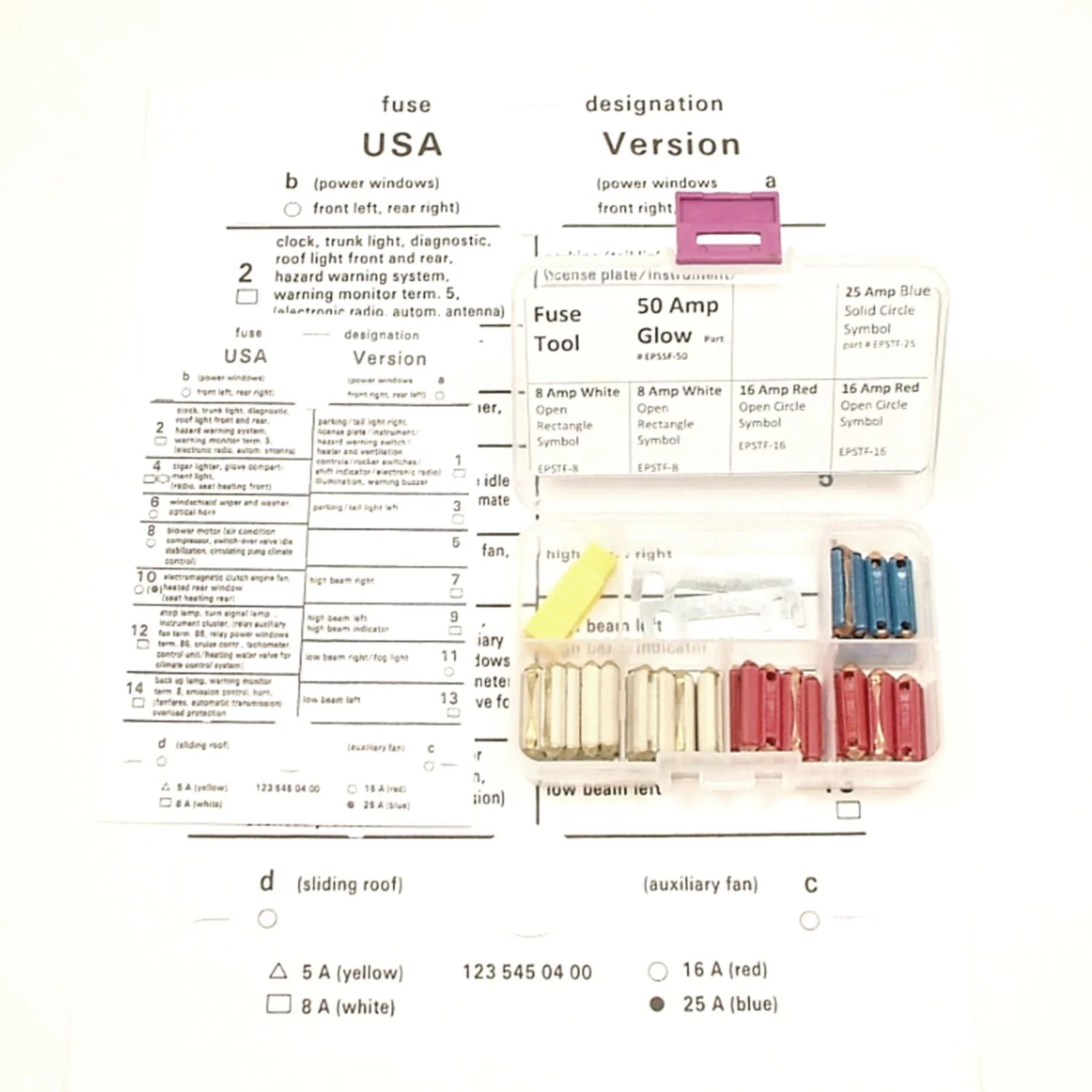 - This kit also includes a small fuse removal tool plus an original size fuse card, plus an 8 1/2″ X 11″ large fuse card.